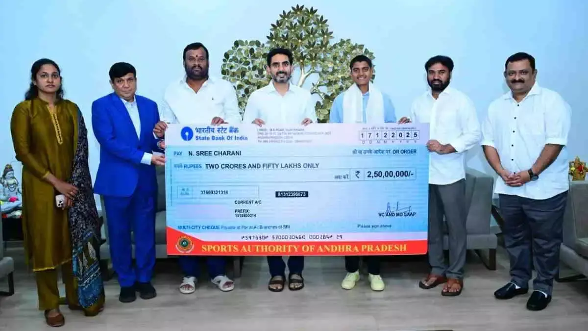 శ్రీచరణికి 2.5 కోట్ల చెక్కు