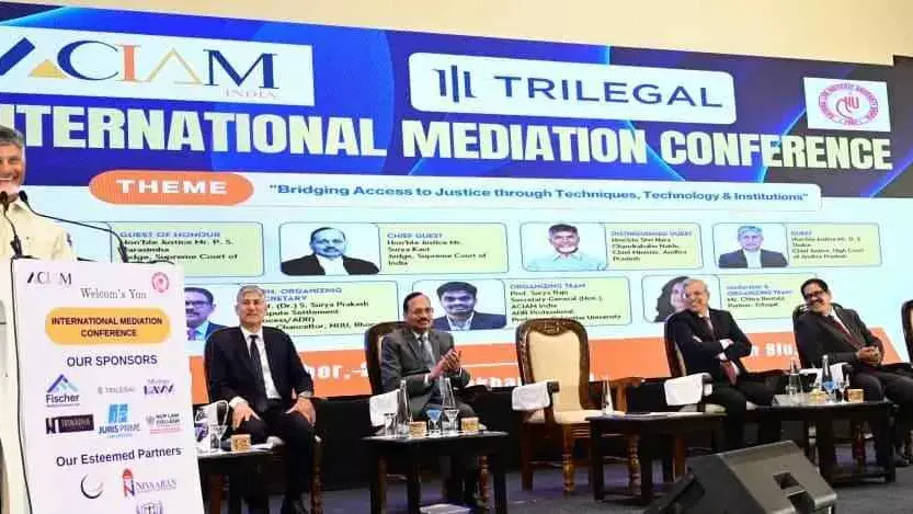 ఈజ్ ఆఫ్ జస్టిస్ వ్యవస్థతోనే సత్వర న్యాయం అందుతుందని ఆంధ్రప్రదేశ్ ముఖ్యమంత్రి నారా చంద్రబాబునాయుడు పేర్కొన్నారు. ఈ వ్యవస్థలో మీడియేషన్, ఆర్బిట్రేషన్ ప్రక్రియలే ముఖ్య భూమిక పోషిస్తాయన్నారు. శుక్రవారం విశాఖలోని రాడిసన్ బ్లూ హోటల్లో జరిగిన ఇంటర్నేషనల్ మీడియేషన్ కాన్ఫరెన్స్కు ముఖ్యమంత్రి చంద్రబాబు ముఖ్య అతిథిగా హాజరయ్యారు. ఈ కాన్ఫరెన్స్లో ప్రసంగించిన ఆయన ఏమన్నారంటే?