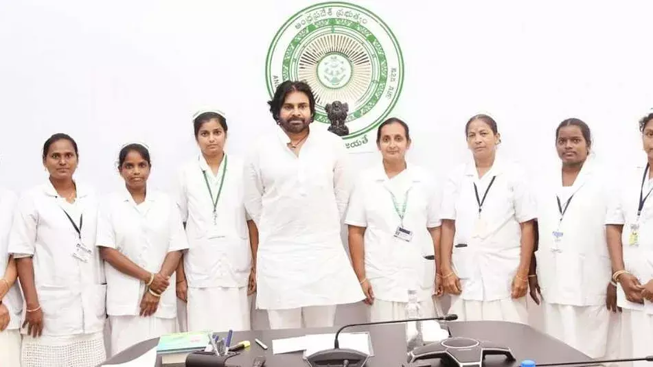 వైద్య రంగంలో నర్సుల సేవలు ప్రసంశనీయమని ఉప ముఖ్యమంత్రి పవన్ కల్యాణ్ అన్నారు. ఫ్లోరెన్స్ నైటింగేల్ స్ఫూర్తితో... రోగులకు స్వస్థత కలిగేలా వృత్తికి గౌరవాన్ని తీసుకువస్తున్నారని కొనియాడారు. నిస్వార్ధంగా వారు అందించే సేవలు వెలకట్టలేనివని అన్నారు. నర్సుల చేతి స్పర్శ కూడా రోగిలో మానసిక స్థైర్యాన్ని, సాంత్వన కలిగిస్తుందని తెలిపారు. అంతర్జాతీయ నర్సుల దినోత్సవాన్ని పురస్కరించుకుని మంగళగిరిలోని జనసేన క్యాంపు కార్యాలయంలో పిఠాపురం నియోజకవర్గం పరిధిలోని ప్రభుత్వ ఆసుపత్రుల్లో పని చేస్తున్న స్టాఫ్ నర్సులతో సమావేశం అయ్యారు. నియోజకవర్గ పరిధిలోని ప్రభుత్వ ఆసుపత్రులలో ప్రశంసనీయ సేవలు అందించిన ఎనిమిది మంది స్టాఫ్ నర్సులను పవన్ కల్యాణ్ సత్కరించారు. వారి సమస్యలు అడిగి తెలుసుకున్నారు.