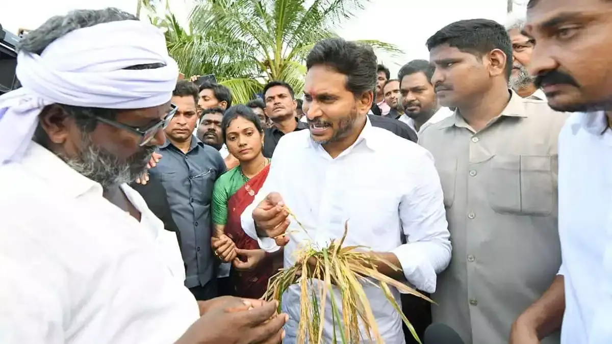 తుపాను వల్ల గింజరాలిన వరి కంకులు పరిశీలిస్తున్న మాజీ సీఎం జగన్