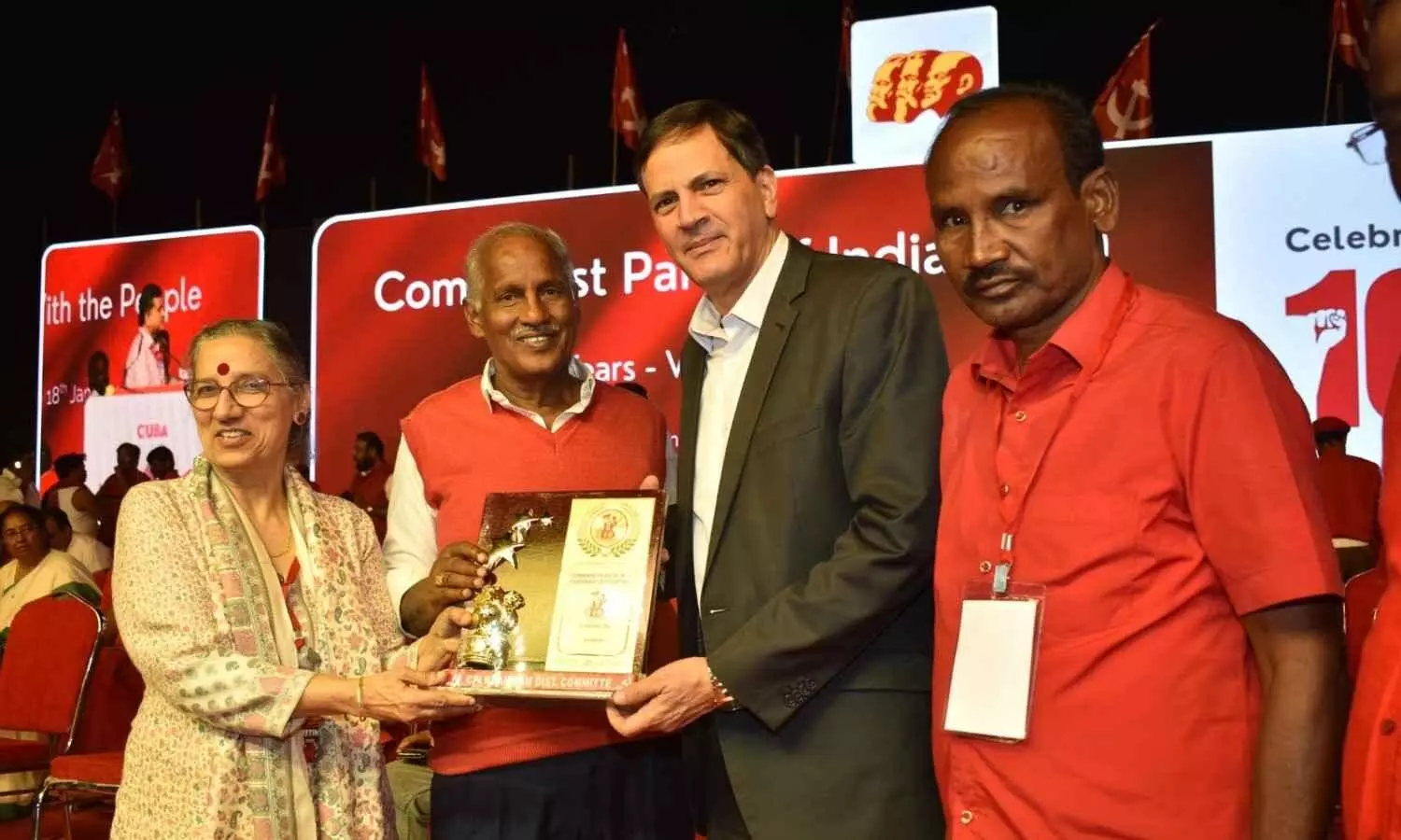 క్యూబా కమ్యూనిస్టు పార్టీ ప్రతినిధికి జ్ఞాపిక అందజేస్తున్న ఏఐటీయూసీ ప్రధాన కార్యదర్శి అమర్జిత్ కౌర్