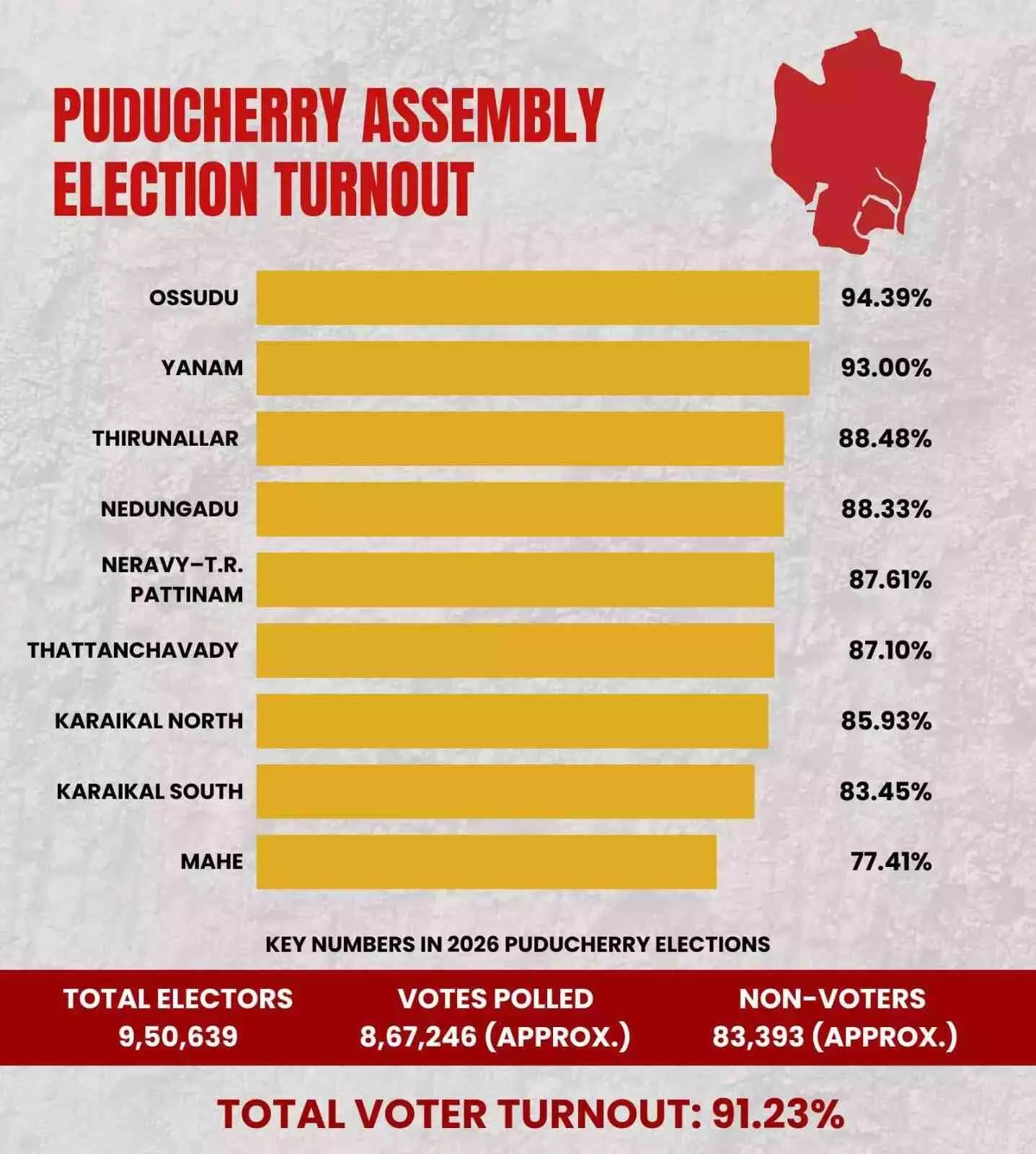 2026 పుదుచ్చేరి అసెంబ్లీ ఎన్నికలు చరిత్రలో ఒక కొత్త అధ్యాయాన్ని లిఖించాయి. అత్యధికంగా ఓటింగ్ శాతం 91.23గా నమోదైంది. 1964 తర్వాత ఈ స్థాయిలో నమోదు కావడం విశేషం. కేంద్రపాలిత ప్రాంతంగా ఏర్పడినప్పటి నుంచి ఇదే రికార్డు స్థాయి పోలింగ్గా నిలిచింది.