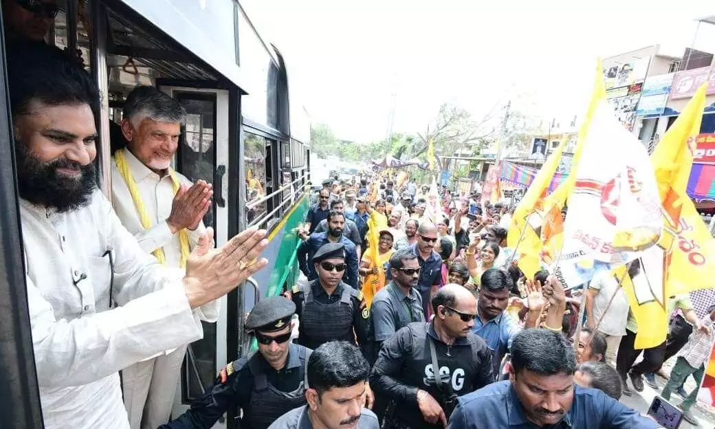 పవన్ కల్యాణ్ బస్సులో సందడి చేశారు.