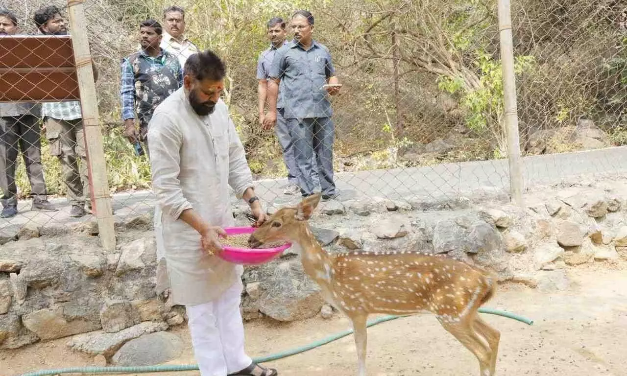 నిన్న ఆయన బాపట్ల జిల్లా కోటప్పకొండకు వెళ్లారు. సందడి చేశారు. కొండ చుట్టూ ప్రదక్షిణలు చేశారు. మంగళగిరి వెళుతూ కోటప్పకొండ ఘాట్ రోడ్డులో ఉన్న వన విహారి జింకల పార్కుకు వెళ్లారు. చాలా సేపు అక్కడ గడిపారు. ప్రకృతిని చూసి పరవశించారు. వన విహారి జింకల పార్కులోకి వెళ్లి జింకలకు ఆహారం అందించారు. ఇక్కడ మచ్చల జింకల్ని గోముగా నిమిరి అక్కున చేర్చుకున్నారు. ఈ జింకల సంరక్షణకు ఇబ్బందులు కలగకుండా పర్యాటకుల సందర్శనకు అనుమతిస్తున్నామని ఎఫ్ఆర్వో మాధవరావు వివరించారు. వివిధ రకాల పక్షి జాతులు, వృక్షాలు, వాటివల్ల కలుగుతున్న ప్రయోజనాల్ని డీఎఫ్వో తెలియజేశారు.