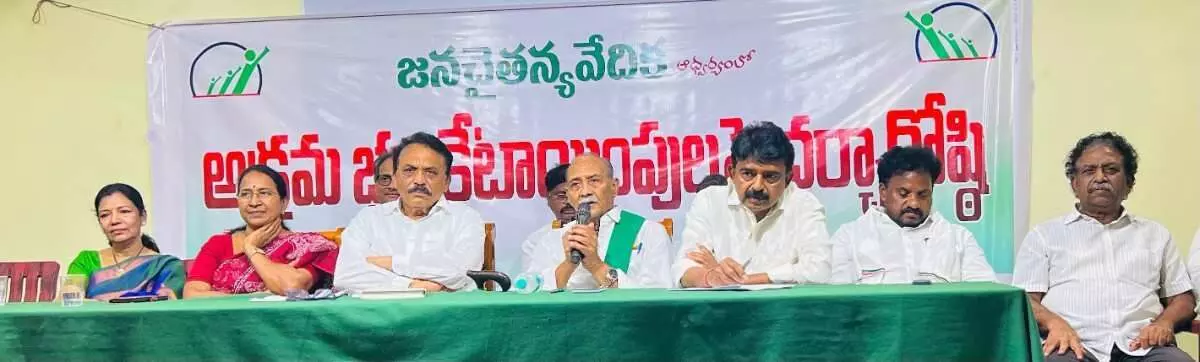 జన చైతన్య వేదిక రాష్ట్ర అధ్యక్షుడు వల్లంరెడ్డి లక్ష్మణరెడ్డి మాట్లాడుతూ.. అమరావతిలో ఆర్బీఐకి ఎకరా 4 కోట్లకు అమ్మి, ప్రైవేట్ విద్యా సంస్థలకు మాత్రం 50 లక్షలకే ఇవ్వడం వెనుక ఉన్న మర్మమేంటని ప్రశ్నించారు. కూటమి ప్రభుత్వం అధికారంలోకి వచ్చిన నాటి నుండి జరిగిన భూ కేటాయింపులపై శ్వేతపత్రం విడుదల చేయాలని డిమాండ్ చేశారు. మంత్రివర్గ సమావేశం జరిగిన ప్రతిసారీ భూముల కేటాయింపులు ఉండటం గమనార్హమన్నారు.