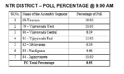 - 13 May 2024 10:09 AM ISTఉదయం 9 గంటలకు వరకు ఎన్టీఆర్ జిల్లాలో 8.95 శాతం పోలింగ్ నమోదయింది. విజయవాడ ఈస్ట్లో అత్యధికంగా 12శాతం పోలింగ్ నమోదైంది.