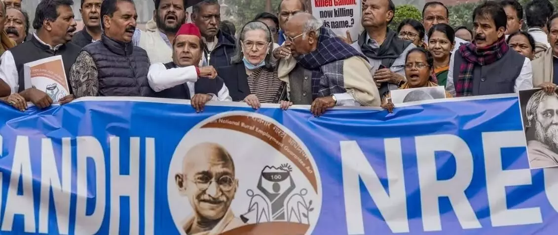 భారతదేశ గ్రామీణ ఆర్థిక వ్యవస్థకు వెన్నెముకగా నిలిచిన మహాత్మా గాంధీ జాతీయ గ్రామీణ ఉపాధి హామీ పథకం (MGNREGA) ఇప్పుడు వివాదంలో చిక్కుకుంది. మహాత్మాగాంధీ పేరు తీసేయడం ఒకటైతే బీజేపీ అభివాదమైన రామ్, రామ్ జీని (జీ రామ జీ) గుర్తు చేసేలా పేరు పెట్టడం మరో ఎత్తయింది. కేంద్ర ప్రభుత్వం ప్రతిపాదించిన "వికసిత్ భారత్ — గ్యారంటీ ఫర్ రోజ్గార్ అండ్ ఆజీవిక మిషన్ (గ్రామీణ) బిల్ - 2025 (G-RAM G)"ను గురువారం (డిసెంబర్ 18) లోక్ సభలో పాసైంది. ఈ సందర్భంగా పార్లమెంటులో పెద్దఎత్తున గొడవ జరిగింది. గ్రామీణ కార్మికులకు హామీనా… లేక హక్కుల కోతనా?' అనే దానిపై చర్చ సాగింది. ఈ బిల్లు- మహాత్మా గాంధీ జాతీయ గ్రామీణ ఉపాధి హామీ చట్టాన్ని పూర్తిగా మార్చేస్తోంది. కేంద్ర ప్రభుత్వ ఆధీనంలో నడిచే ఓ పథకంగా మిగులుతుందని విపక్షాలు ఆరోపించాయి.