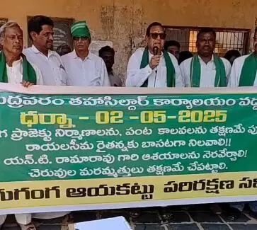 తెలుగుగంగ ప్రాజెక్టు నిర్మాణాలను, పంట కాలవలను తక్షణమే పూర్తి చేసి రుద్రవరం, చాగలమర్రి మండలలాలలోని చెరువులకు మరమ్మత్తులు చేపట్టి ఆయకట్టు సంరక్షించాలని ప్రజలకు త్రాగు నీరు అందించాలని రాయలసీమ సాగునీటి సాధన సమితి అధ్యక్షులు బొజ్జా దశరథరామిరెడ్డి ప్రభుత్వానికి విజ్ణప్తి చేసారు. శుక్రవారం నంద్యాల జిల్లా రుద్రవరం మండల తహశీల్దారు కార్యాలయం దగ్గర తెలుగుగంగ ప్రాజెక్టు నిర్మాణాలను, పంట కాలువలను తక్షణమే చేపట్టాలని కోరుతూ తెలుగుగంగ ఆయకట్టు పరిరక్షణ సమితి ఆద్వర్యంలో ధర్నా నిర్వహించారు.
