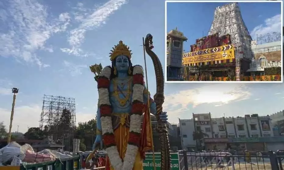 తెలుగు నూతన సంవత్సర పండుగను పురస్కరించుకుని తిరుమల క్షేత్రం వద్ద పుష్పాలంకరణ కనువిందు చేస్తోంది. ఆలయం వెలుపల గొల్లమండపం సమీపంలో ఫల, పుష్పాలతో చేసిన దేవతామూర్తుల విగ్రహాలు ఆకట్టుకుంటున్నాయి.