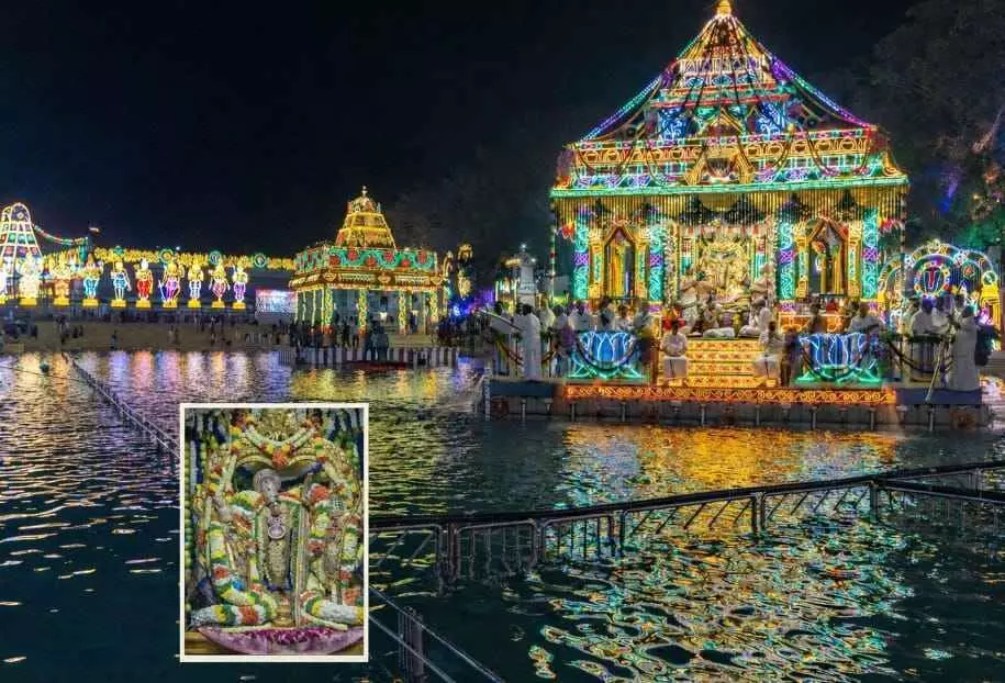 తిరుమల శ్రీవారి పుష్కరిణిలో కనువిందు చేస్తున్న తెప్పోత్సవం. ఇన్సెట్ లో శ్రీరామచంద్రమూర్తిగా మలయప్ప